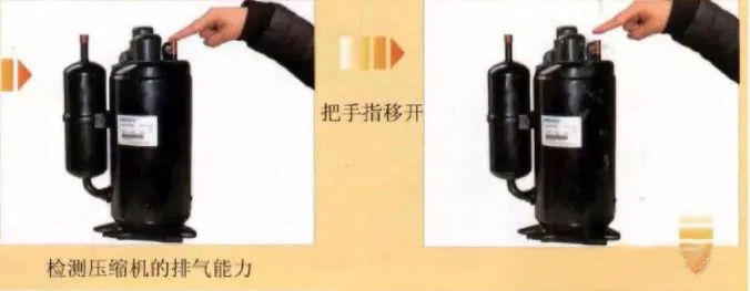 首先,將壓縮機(jī)卸下, 加電使其運(yùn)轉(zhuǎn),用手指堵住壓縮機(jī)的排氣孔片刻, 再將手指移開。 由于壓縮機(jī)內(nèi)有壓力, 所以當(dāng)用手堵住壓縮機(jī)的排氣孔時, 應(yīng)感到有排氣壓力;當(dāng)把手指移開時, 可以聽到 “呲呲的排氣聲, 而且排氣壓力正常的壓縮機(jī),應(yīng)很難堵住壓縮機(jī)排除的氣體,這表明壓縮機(jī)性能良好。如果用手堵住排氣管時感覺不到壓力, 將手指移開時,聽不到排氣聲, 則說明該壓縮機(jī)性能不良。如下圖所示: