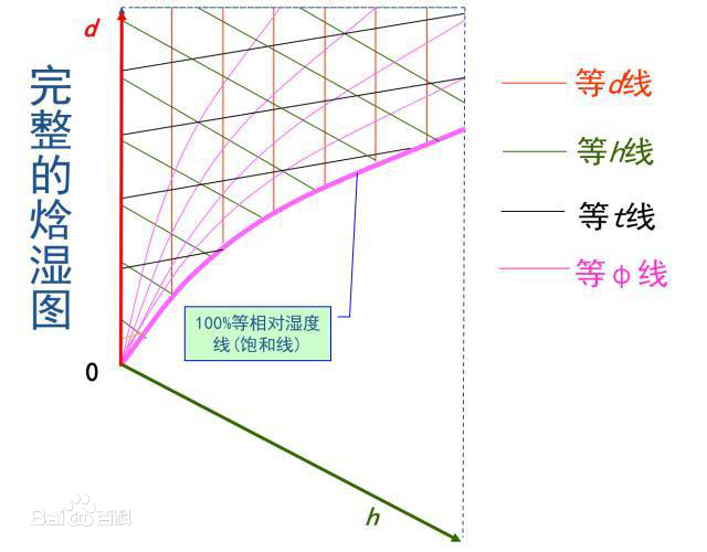 以比焓h-縱坐標,以含濕量d-橫坐標,表示大氣壓力B一定時濕空氣各個參數之間的關系。包含五種線群: